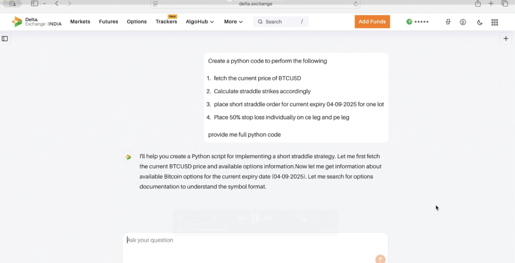 API Copilot on Delta Exchange solves this coding bottleneck in an easy way. It sits right inside the platform, as a user-friendly AI assistant tuned to the needs of crypto traders – not generic coders. You can interact with Copilot much like texting a friend or using ChatGPT, only now – with a crypto trading focus – it’s actually writing, fixing, and explaining code as you build your strategies.